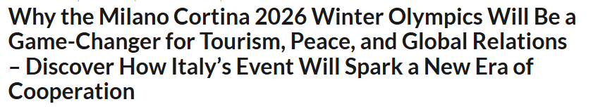 文章認為,2026年米蘭-科爾蒂納冬季奧運會舉辦的意義遠不止于爭奪金牌,還將有力推動全球旅游業(yè)復蘇、促進和平理念傳播,并通過體育運動將不同文化緊密連接。