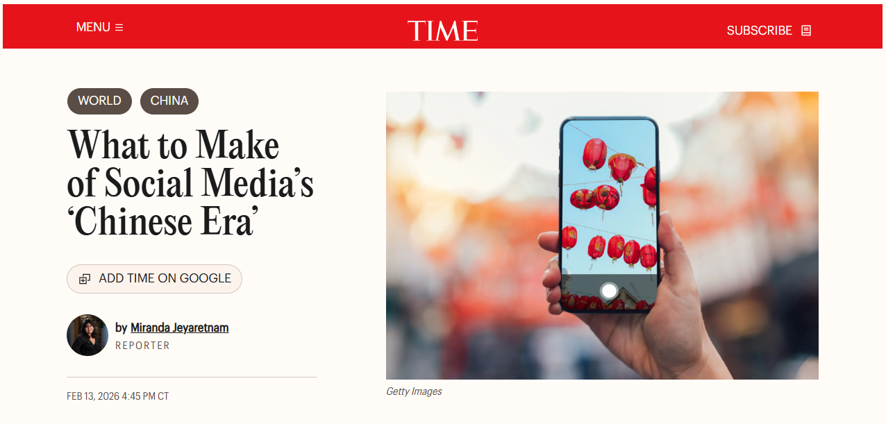 美國《時代》周刊網(wǎng)站2月13日的一篇文章稱,伴隨著今年的中國新年,社交網(wǎng)絡(luò)上介紹中國文化的內(nèi)容不少。這是一種新的趨勢,美國社交媒體用戶視自己為“中國人”,擁抱“Chinese era”(中國時代)或者“Chinamaxxing”(極致中國化)。觀察家分析,這一趨勢反映了隨著中國的開放和軟實力的提升,人們對中國越來越著迷。