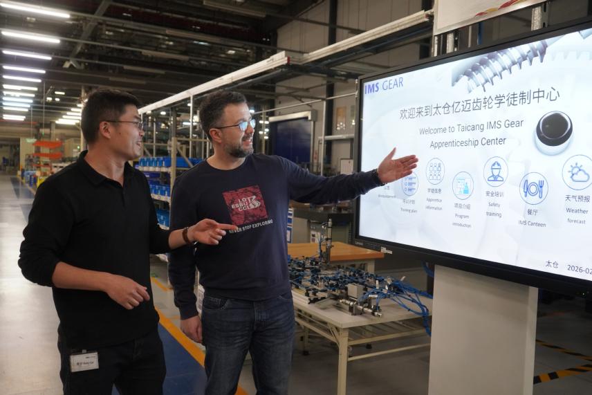 2026年2月24日,培訓(xùn)師托馬斯(右)在億邁齒輪(太倉(cāng))有限公司講解雙元制培訓(xùn)。(圖片來(lái)源:新華社)