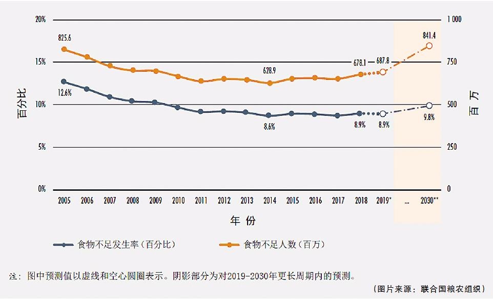 全球食物不足發(fā)生率及人數(shù)逐年統(tǒng)計(jì)和預(yù)測(cè)圖(圖片來源:聯(lián)合國糧農(nóng)組織)