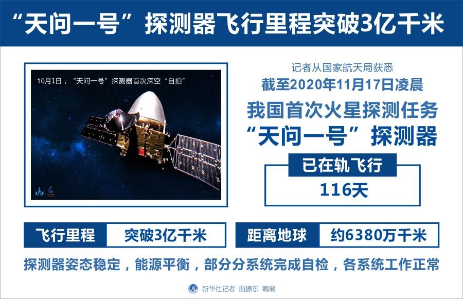 新華社北京11月17日電(記者胡喆)記者從國家航天局獲悉,截至2020年11月17日凌晨,我國首次火星探測任務(wù)“天問一號”探測器已在軌飛行116天,飛行里程突破3億千米,距離地球約6380萬千米。探測器姿態(tài)穩(wěn)定,能源平衡,部分分系統(tǒng)完成自檢,各系統(tǒng)工作正常。