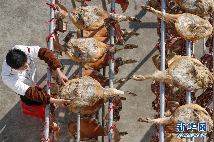 隨著春節(jié)臨近,安徽省黃山市徽州區(qū)西溪南鎮(zhèn)村民開始制作徽州傳統(tǒng)臘味,腌制火腿、臘肉,灌制香腸,并進(jìn)行晾曬。臘味飄香,年味漸濃,制作、晾曬傳統(tǒng)臘味成為徽州一道獨(dú)特風(fēng)景。新華網(wǎng)發(fā)(施亞磊攝)