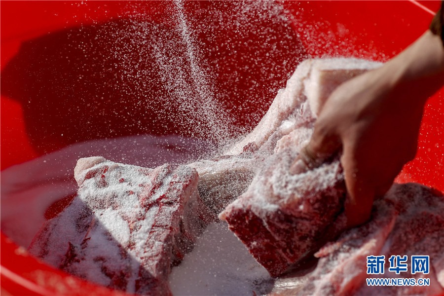 1月19日,在黃山市徽州區(qū)西溪南鎮(zhèn),村民正在腌制臘味。