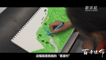 在四川大涼山,12歲的額其古伍畫下“懸崖村”之變。從藤梯、鋼梯到樓梯,人民對美好生活的向往,就是中國共產黨的奮斗目標。