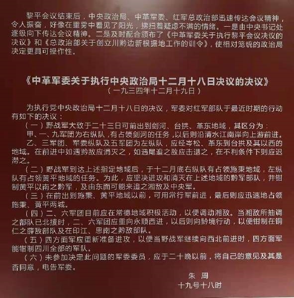 黎平會(huì)議結(jié)束后,中央政治局、中革軍委、紅軍總政治部迅速傳達(dá)貫徹會(huì)議精神。