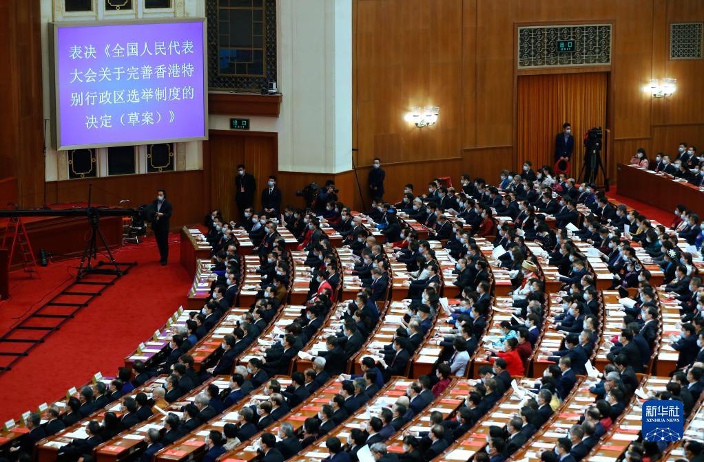 3月11日,十三屆全國人大四次會(huì)議表決通過《全國人民代表大會(huì)關(guān)于完善香港特別行政區(qū)選舉制度的決定》。這是繼制定實(shí)施香港國安法后,中央依法治港的又一重大舉措,是完善“一國兩制”制度體系、落實(shí)中央對(duì)香港全面管治權(quán)的具體體現(xiàn),為全面落實(shí)“愛國者治港”原則提供了更加堅(jiān)實(shí)的制度保障。3月30日,十三屆全國人大常委會(huì)第二十七次會(huì)議通過了新修訂的香港基本法附件一和附件二。隨后,香港特別行政區(qū)完成本地立法。新選舉制度為推進(jìn)香港民主穩(wěn)步發(fā)展、實(shí)現(xiàn)良政善治,促進(jìn)“一國兩制”實(shí)踐行穩(wěn)致遠(yuǎn)打下堅(jiān)實(shí)基礎(chǔ)。