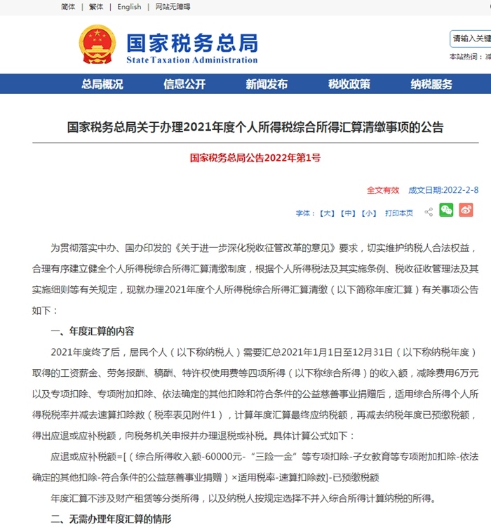 為貫徹落實(shí)中辦、國辦印發(fā)的《關(guān)于進(jìn)一步深化稅收征管改革的意見》要求,切實(shí)維護(hù)納稅人合法權(quán)益,合理有序建立健全個(gè)人所得稅綜合所得匯算清繳制度,根據(jù)個(gè)人所得稅法及其實(shí)施條例、稅收征收管理法及其實(shí)施細(xì)則等有關(guān)規(guī)定,現(xiàn)就辦理2021年度個(gè)人所得稅綜合所得匯算清繳(以下簡稱年度匯算)有關(guān)事項(xiàng)公告如下: