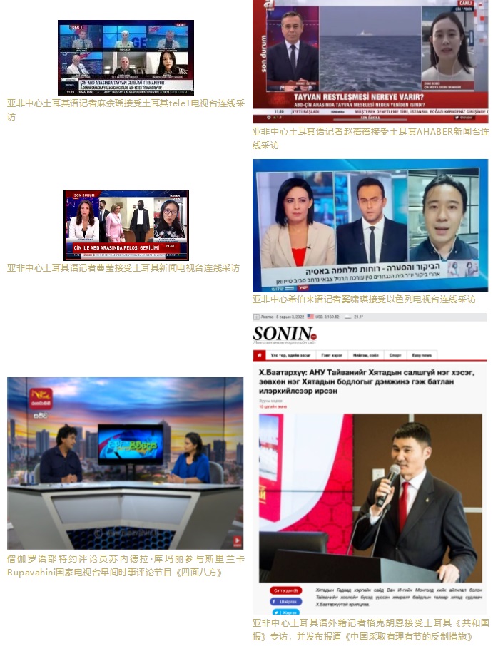 亞非中心土耳其、希伯來語、豪薩語、尼泊爾語、蒙古語等多語種主播、評論員和網(wǎng)紅積極在多家外媒發(fā)聲,接受了包括以色列電視臺、土耳其AHABER新聞臺、土耳其TGRT電視臺、土耳其新聞電視臺等多家國際媒體的采訪連線,同時多名外籍記者、海外特約評論員在尼日利亞《領導者報》網(wǎng)站、尼泊爾《光線新聞網(wǎng)》、肯尼亞《人民報》、蒙古國媒體SONIN.MN等對象國主流媒體發(fā)表評論及署名文章,對外闡釋中方立場和反制措施的合理性、正當性,介紹臺灣問題歷史經緯,揭批美國在臺灣問題上的背信棄義。