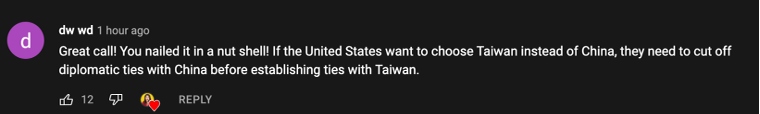 網(wǎng)友dw wd:“精彩的一期視頻!你簡潔而清晰地呈現(xiàn)了內容,如果美國真的想選擇與臺灣建立所謂的‘外交關系’,他們首先需要與中國斷交。”