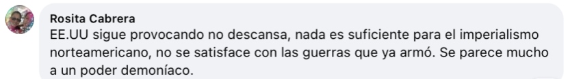 烏拉圭網(wǎng)友Rosita Cabrera:“美國一直在挑釁,不眠不休,對美帝國主義來說什么都不夠,它不滿足于已經發(fā)動的那些戰(zhàn)爭,它就是邪惡勢力?!?/p>
