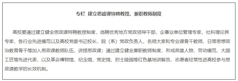 14.建設(shè)專兼結(jié)合的師資隊伍。各地各校嚴(yán)格按照要求配備建強高校專職思政課教師、輔導(dǎo)員隊伍,提高中小學(xué)專職思政課教師比例,實行思政課特聘教授、兼職教師制度,積極聘請黨政領(lǐng)導(dǎo)、科學(xué)家、老同志、先進(jìn)模范等擔(dān)任思政課兼職教師。深入實施馬克思主義學(xué)院院長(書記)培養(yǎng)工程,通過集中培養(yǎng)培訓(xùn)、委托重大項目、加強實踐鍛煉、開展國際國內(nèi)訪學(xué)等方式,培養(yǎng)一批青年馬克思主義理論家。
