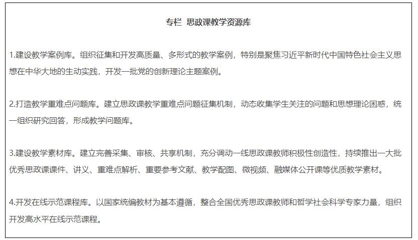 19.全面推進(jìn)課程思政高質(zhì)量建設(shè)。教育部組建高等學(xué)校課程思政教學(xué)指導(dǎo)委員會,研制普通本科專業(yè)類課程思政教學(xué)指南,組織開展高校教師課程思政教學(xué)能力培訓(xùn),建設(shè)一批課程思政系列共享資源庫。建成一批課程思政示范高校,推出一批課程思政示范課程,選樹一批課程思政教學(xué)名師和團(tuán)隊,建設(shè)一批高校課程思政教學(xué)研究示范中心。加強中小學(xué)學(xué)科德育建設(shè)。