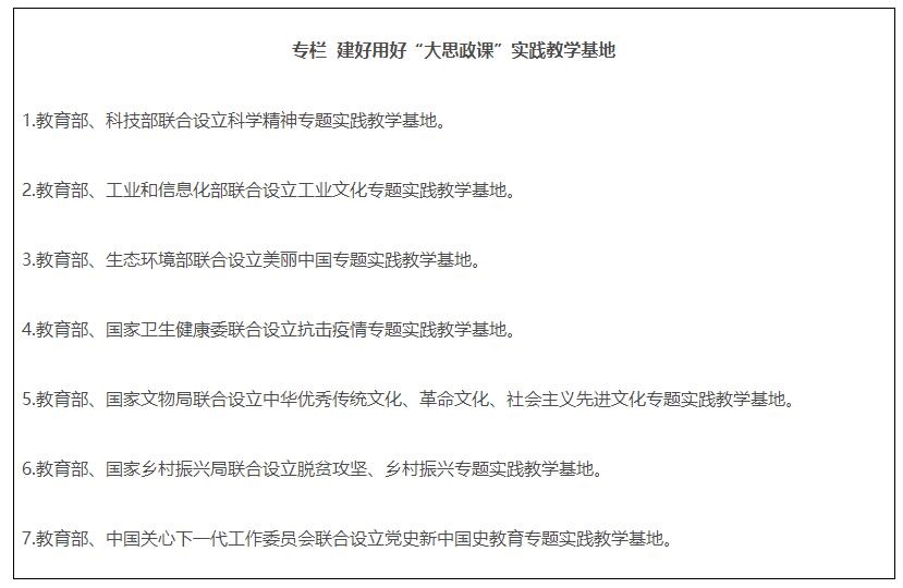 10.建好用好實踐教學(xué)基地。教育部會同有關(guān)部門,利用現(xiàn)有基地(場館),分專題設(shè)立一批“大思政課”實踐教學(xué)基地。發(fā)揮好教育部高校思政課教師研學(xué)基地的實踐教學(xué)功能。各地教育部門要結(jié)合實際,積極建設(shè)“大思政課”實踐教學(xué)基地。大中小學(xué)要主動對接各級各類實踐教學(xué)基地,開發(fā)現(xiàn)場教學(xué)專題,開展實踐教學(xué)。有條件的學(xué)??膳c有關(guān)基地建立長效合作機制,加強研究和資源開發(fā)。各基地要積極創(chuàng)造條件,與各地教育部門、學(xué)校建立有效工作機制,協(xié)同完成好實踐教學(xué)任務(wù)。