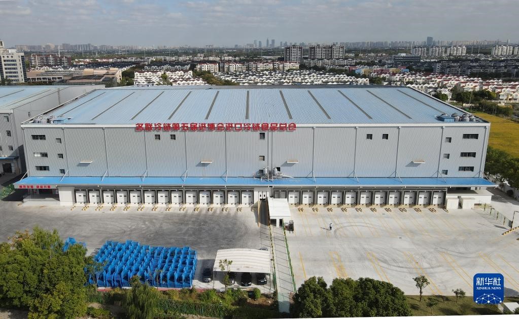 10月20日,空中俯瞰位于上海青浦區(qū)的名聯(lián)冷鏈第五屆進(jìn)博會(huì)進(jìn)口冷鏈?zhǔn)称房倐}(無人機(jī)照片)。新華社記者 方喆攝