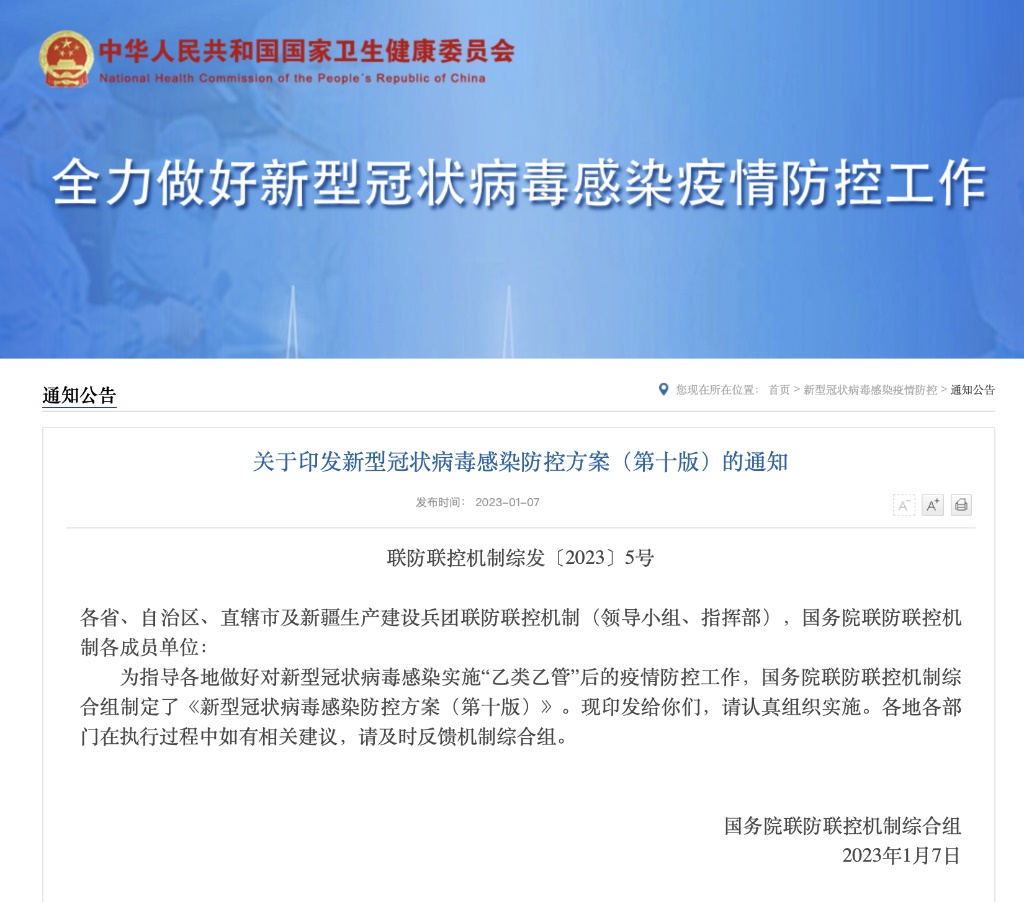 國務院聯(lián)防聯(lián)控機制綜合組印發(fā)第十版新型冠狀病毒感染防控方案