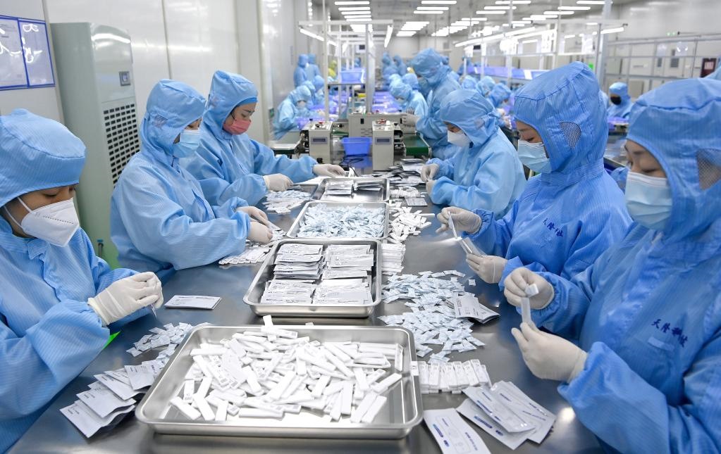西安一家醫(yī)療器械企業(yè)的工作人員在生產(chǎn)抗原檢測試劑(2023年1月4日攝)。 新華社記者 劉瀟 攝