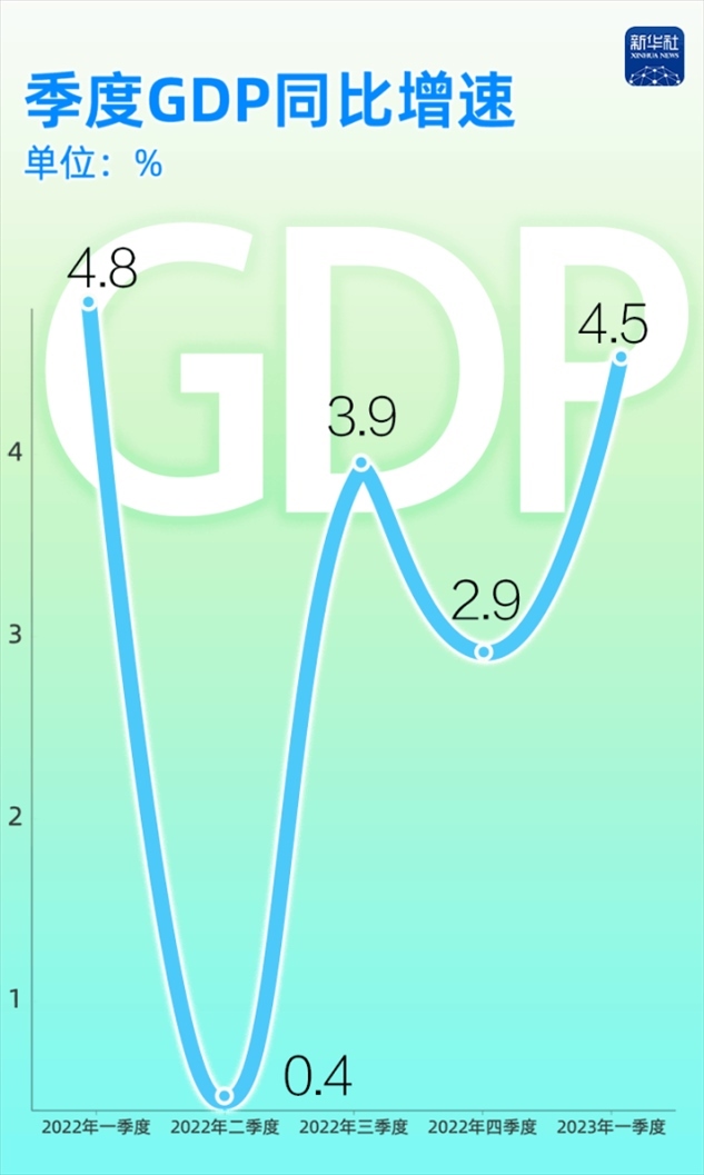 有數(shù)為證:2022年至今,我國的季度GDP同比增速分別為4.8%、0.4%、3.9%、2.9%和4.5%,一季度GDP增速達(dá)到了2022年二季度以來最高水平。