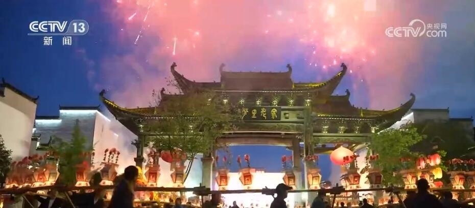 隨著夜色降臨,在江西婺源縣演藝廣場(chǎng)上,百米長(zhǎng)龍演藝隊(duì)伍開(kāi)始游行,浩浩蕩蕩熱舞而行,龍尾鼓壓陣,龍珠引路。伴隨著漫天煙火,板凳龍舞出綽約風(fēng)姿,場(chǎng)面氣勢(shì)恢宏,蔚為壯觀。