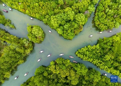 5月2日,游客在江蘇省泰州市姜堰區(qū)溱湖國(guó)家濕地公園內(nèi)乘坐搖櫓船游玩。