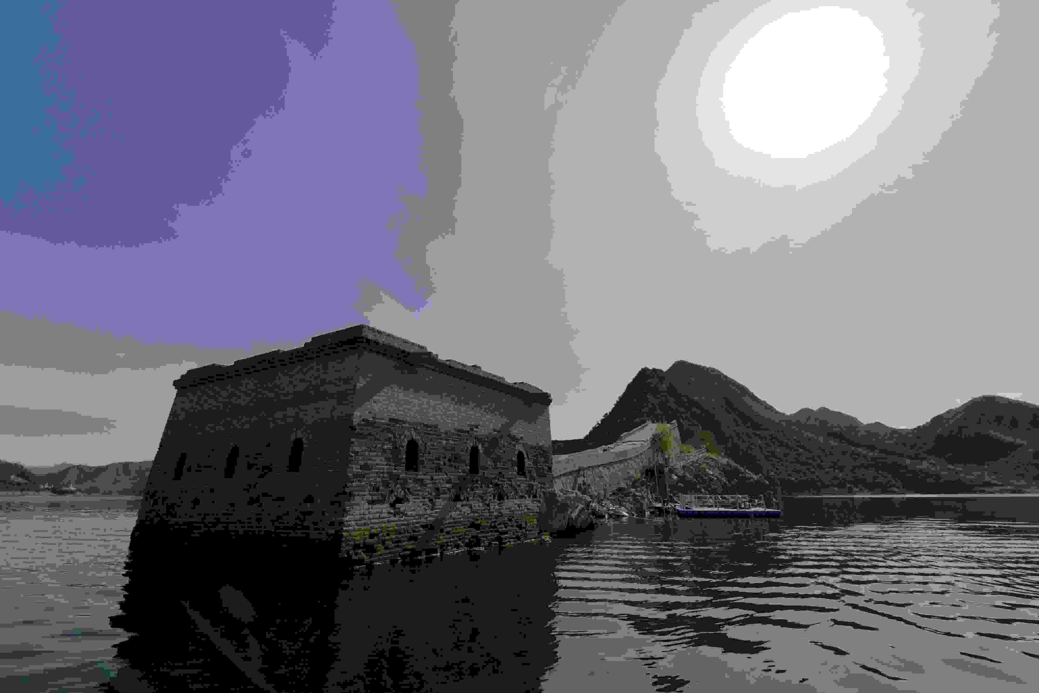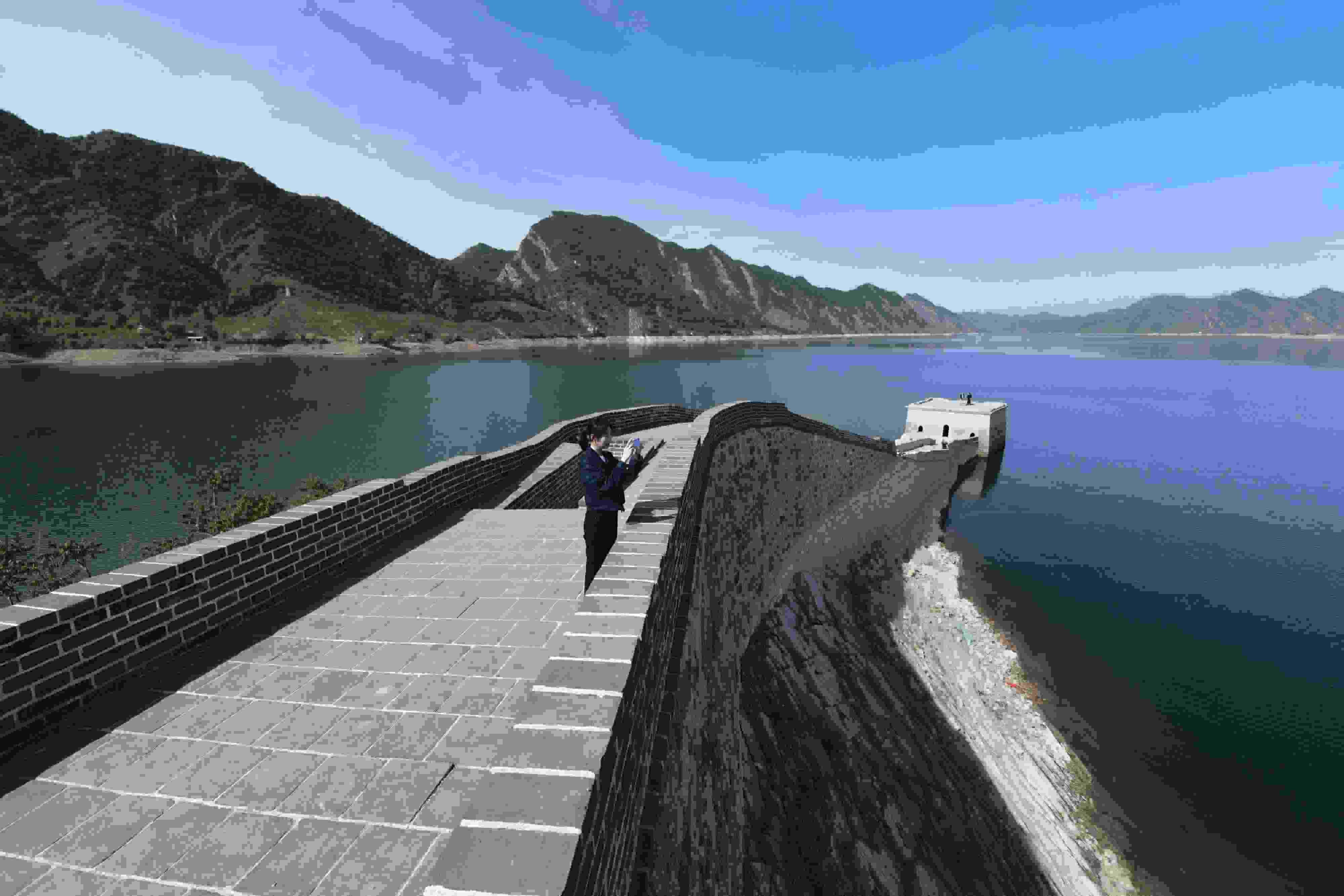 2023年5月8日,河北承德,寬城滿(mǎn)族自治縣境內(nèi)潘家口水庫(kù)的“水下長(zhǎng)城”。這段“水下長(zhǎng)城”是明長(zhǎng)城的遺址,20世紀(jì)70年代因建設(shè)水利樞紐工程,部分長(zhǎng)城隱沒(méi)水下,從而形成“水下長(zhǎng)城”景觀。 視覺(jué)中國(guó)