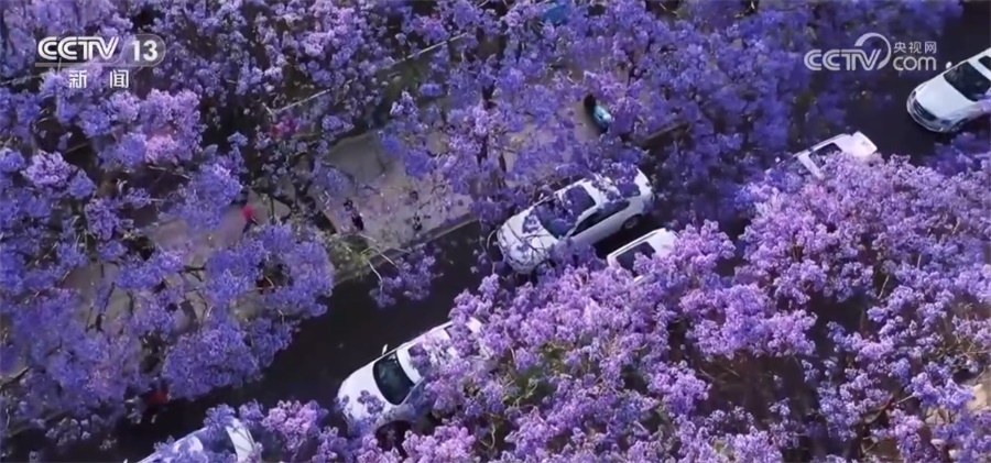 總臺記者 郭琳潔:我現(xiàn)在是在昆明的教場中路,5月上旬,道路兩側(cè)的藍花楹競相綻放,將這條1.4公里長的道路裝扮成一條紫色長廊。