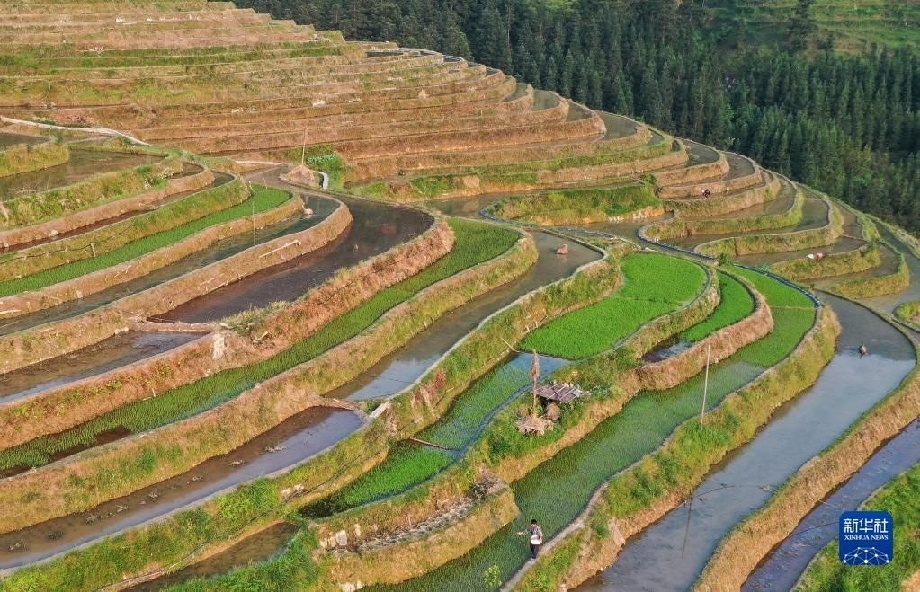 5月6日,農(nóng)民在貴州省從江縣加榜鄉(xiāng)加頁(yè)村的梯田勞作(無(wú)人機(jī)照片)。   新華社發(fā)(羅京來(lái) 攝)