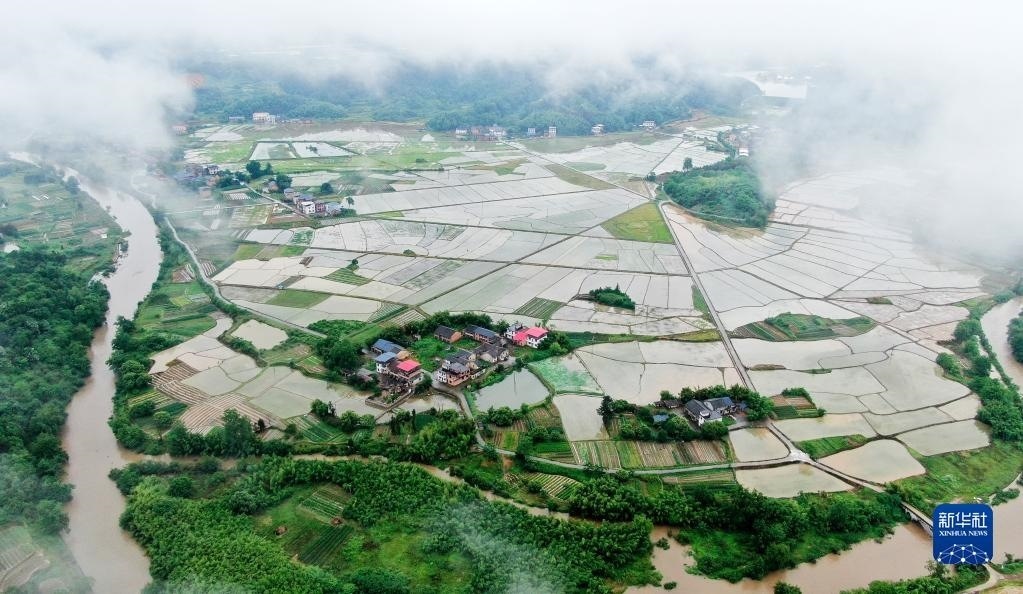 5月6日拍攝的湖南省資興市唐洞街道鏡塘村田園風(fēng)光(無(wú)人機(jī)照片)。   新華社發(fā)(李科攝)