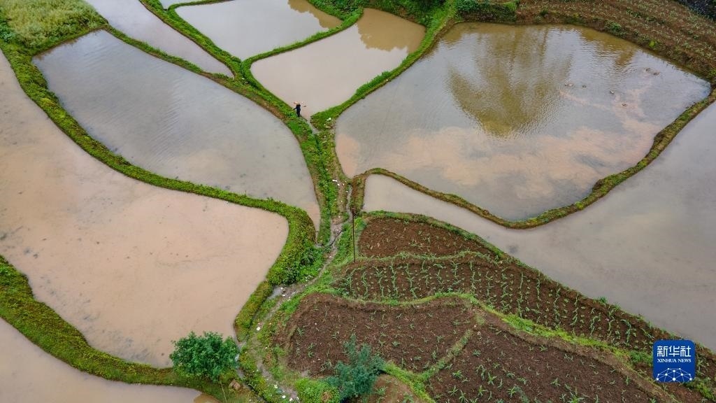 5月6日,在重慶市秀山土家族苗族自治縣洪安鎮(zhèn)美其村,村民在田間行走(無(wú)人機(jī)照片)。   新華社發(fā)(胡程攝)