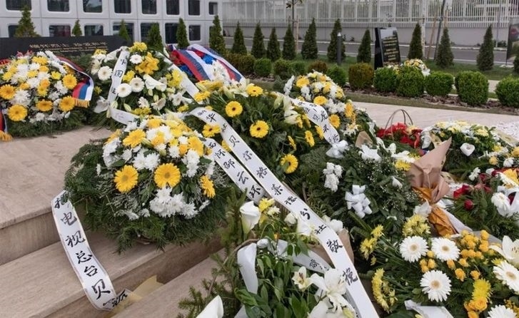 這是2022年5月7日在塞爾維亞貝爾格萊德的中國駐南斯拉夫聯盟大使館舊址紀念碑前拍攝的花圈。新華社發(fā)(王韡 攝)