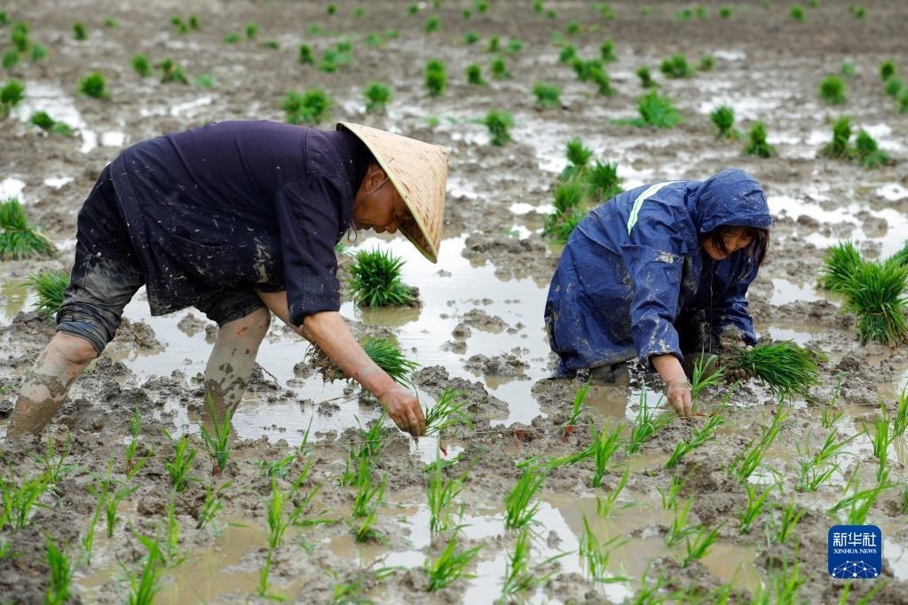 5月9日,在四川省崇州市道明鎮(zhèn)協(xié)和社區(qū),農(nóng)民在一片高標(biāo)準(zhǔn)農(nóng)田里種植水稻。   新華社記者 沈伯韓 攝