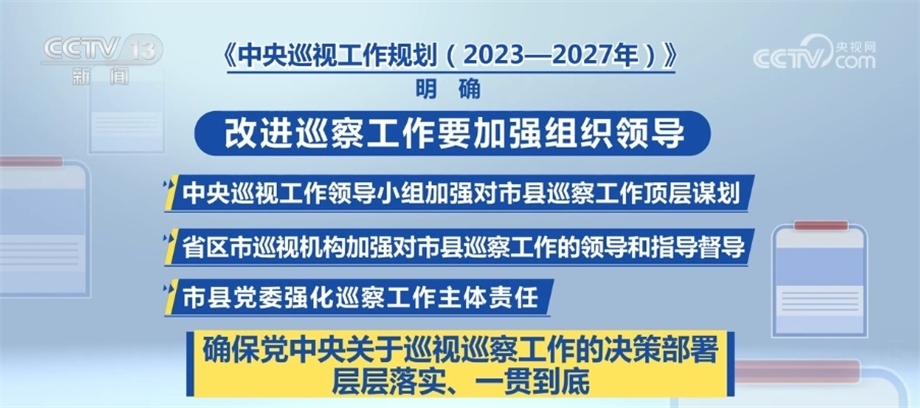 《中央巡視工作規(guī)劃(2023—2027年)》明確,改進(jìn)巡察工作要加強(qiáng)組織領(lǐng)導(dǎo)。中央巡視工作領(lǐng)導(dǎo)小組加強(qiáng)對市縣巡察工作頂層謀劃,省區(qū)市巡視機(jī)構(gòu)加強(qiáng)對市縣巡察工作的領(lǐng)導(dǎo)和指導(dǎo)督導(dǎo),市縣黨委強(qiáng)化巡察工作主體責(zé)任,確保黨中央關(guān)于巡視巡察工作的決策部署層層落實(shí)、一貫到底。