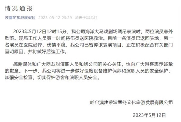 ·哈爾濱波塞冬旅游度假區(qū)就兩位演員在表演時意外墜落發(fā)布情況通報,稱目前一名演員已返回駐地,另一名演員在醫(yī)院治療,傷情平穩(wěn)。