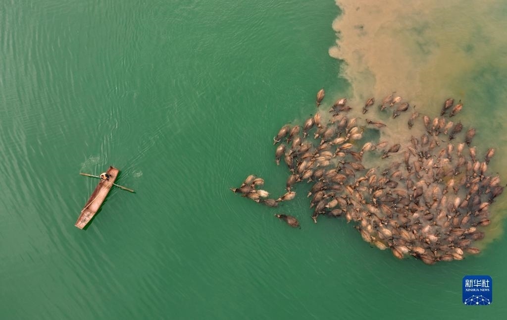 5月13日,在南充市蓬安縣相如鎮(zhèn)油房溝村嘉陵江段,成群結(jié)隊(duì)的水牛渡江(無(wú)人機(jī)照片)。   新華社發(fā)(周修建攝)