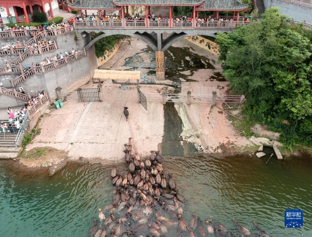 5月13日,在南充市蓬安縣相如鎮(zhèn)油房溝村嘉陵江段,游客觀看牛群渡江上岸(無(wú)人機(jī)照片)。   新華社發(fā)(周修建攝)