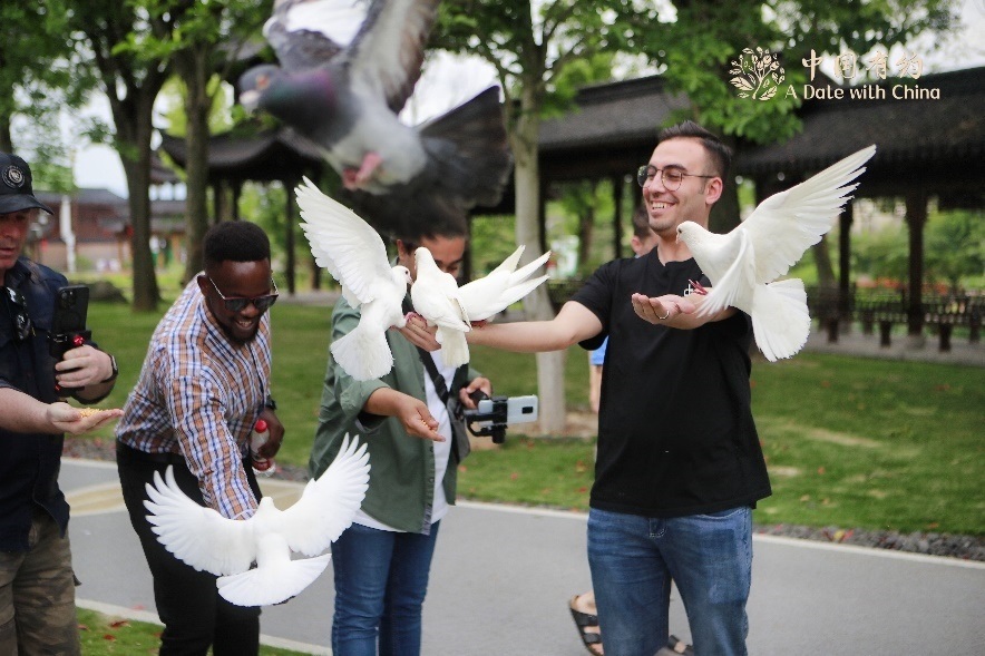 中國有約采訪團(tuán)成員喂食白鴿