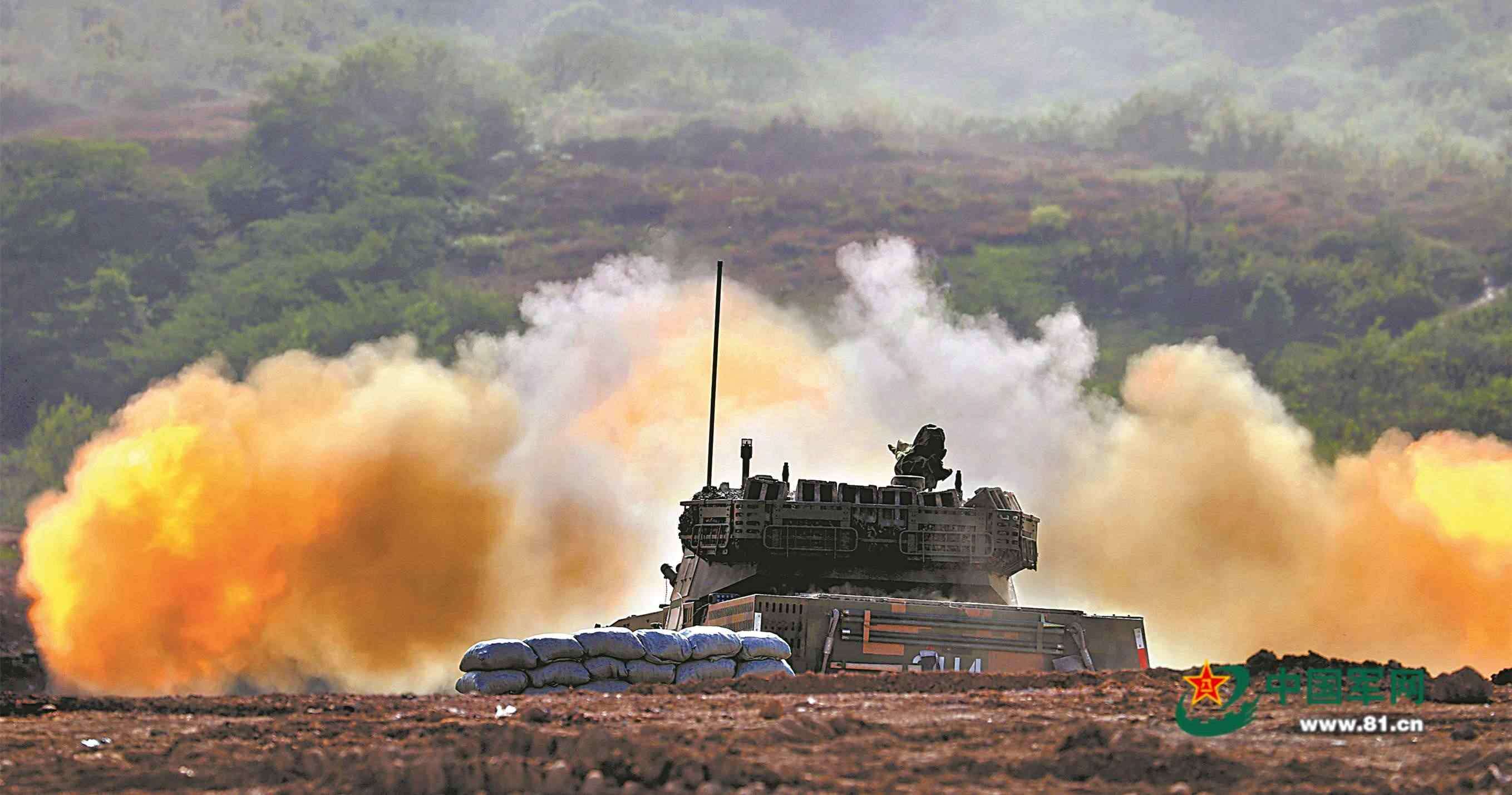 戰(zhàn)機稍縱即逝,偵察隊員立即向指揮所報告情況并呼叫炮火支援。各戰(zhàn)斗小組快速分發(fā)彈藥,戰(zhàn)車迅即駛向預(yù)備陣地?!澳繕?biāo)鎖定,射擊!”剎那間,一發(fā)發(fā)炮彈呼嘯著撲向“敵”陣地。