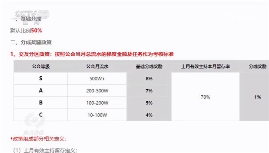 主播得到的打賞,平臺和經(jīng)紀機構(gòu)都會參與分成。一般來說,平臺要首先分走50%的打賞費用,剩下的由主播和經(jīng)紀機構(gòu)來分。從某平臺與主播經(jīng)紀公司的后臺約定中可以看出,當月總流水的梯度金額及任務(wù)作為考核。經(jīng)紀機構(gòu)月流水超過500萬元,至少可以額外拿到8%的獎勵。在這種制度的激勵下,就推動經(jīng)紀公司和主播想方設(shè)法爭取更高額度的打賞。