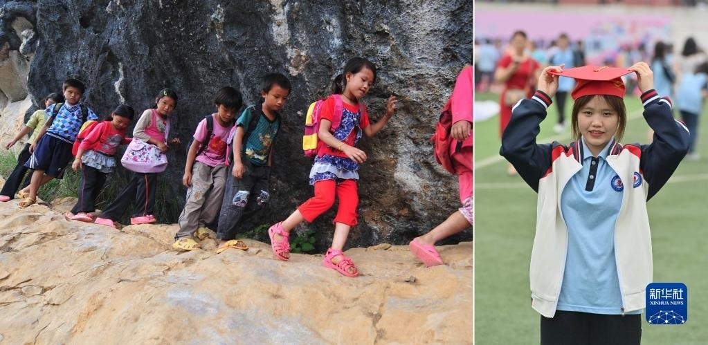 拼版照片:左圖為2012年9月3日,在大化瑤族自治縣板升鄉(xiāng)弄雷村,8歲的蒙麗丹(右一)爬懸崖去學(xué)校讀書;右圖為2023年5月20日,蒙麗丹在廣西大化瑤族自治縣高級中學(xué)高三成人禮上(新華社記者胡星宇攝)。即將參加高考的蒙麗丹,希望以后能回到大山里當(dāng)老師。
