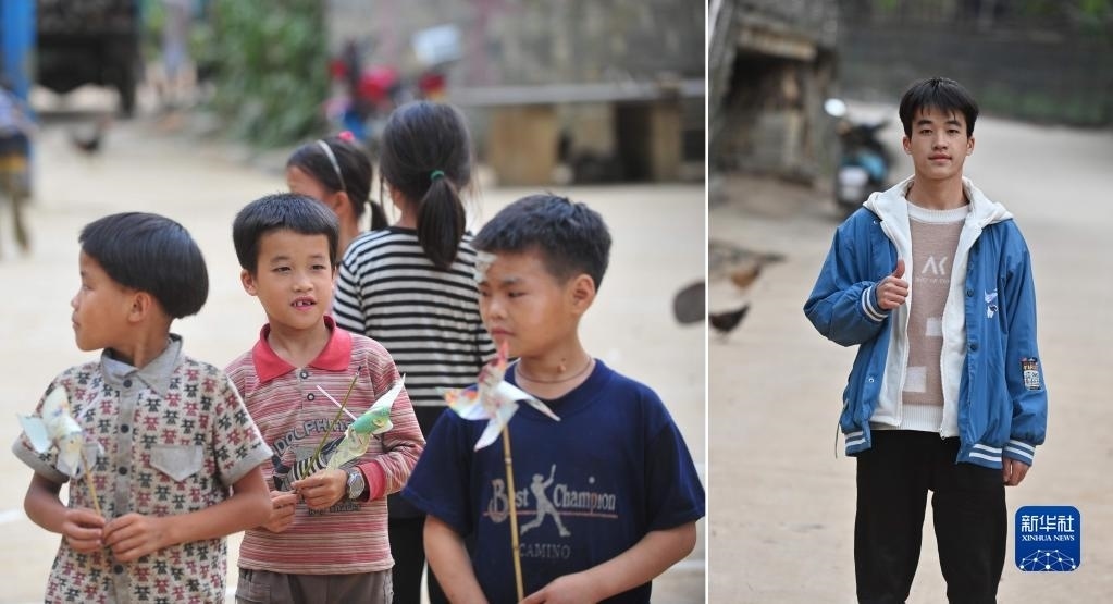 拼版照片:左圖為2012年7月4日,在大化瑤族自治縣板升鄉(xiāng)弄勇小學(xué),7歲的蒙旺兵(左二)在校園里玩風(fēng)車;右圖為2023年1月25日,在大化瑤族自治縣板升鄉(xiāng)弄勇村,正在桂林理工大學(xué)讀大一的蒙旺兵寒假回家時在村中留影。 新華社記者 黃孝邦 攝