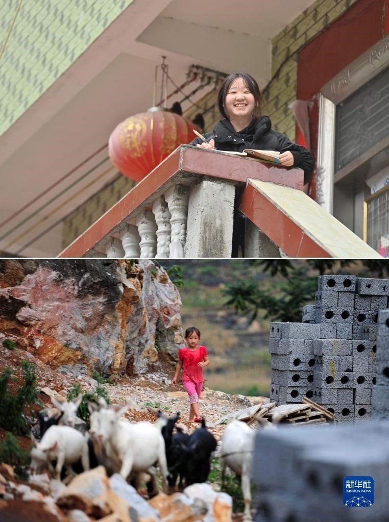 拼版照片:上圖為2023年1月16日,在大化瑤族自治縣板升鄉(xiāng)弄勇村,正在讀初中的藍(lán)秀雪在家門口學(xué)習(xí);下圖為2013年7月14日,5歲的藍(lán)秀雪在放羊。16歲的藍(lán)秀雪即將參加中考,希望能考上一所好高中。