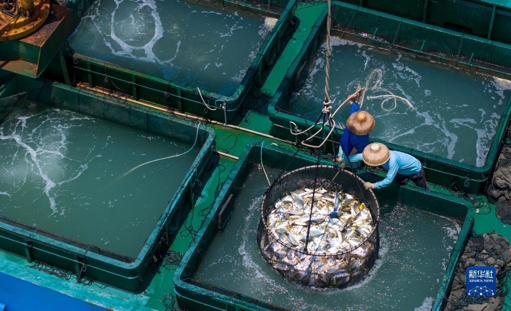 5月27日,在湛江市徐聞縣西連鎮(zhèn),漁業(yè)工人從徐聞國(guó)橋深海養(yǎng)殖有限公司的金鯧魚(yú)深海網(wǎng)箱捕魚(yú)(無(wú)人機(jī)照片)。