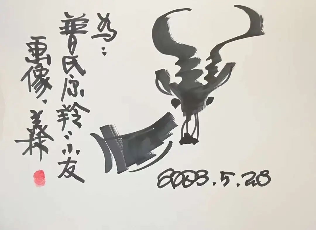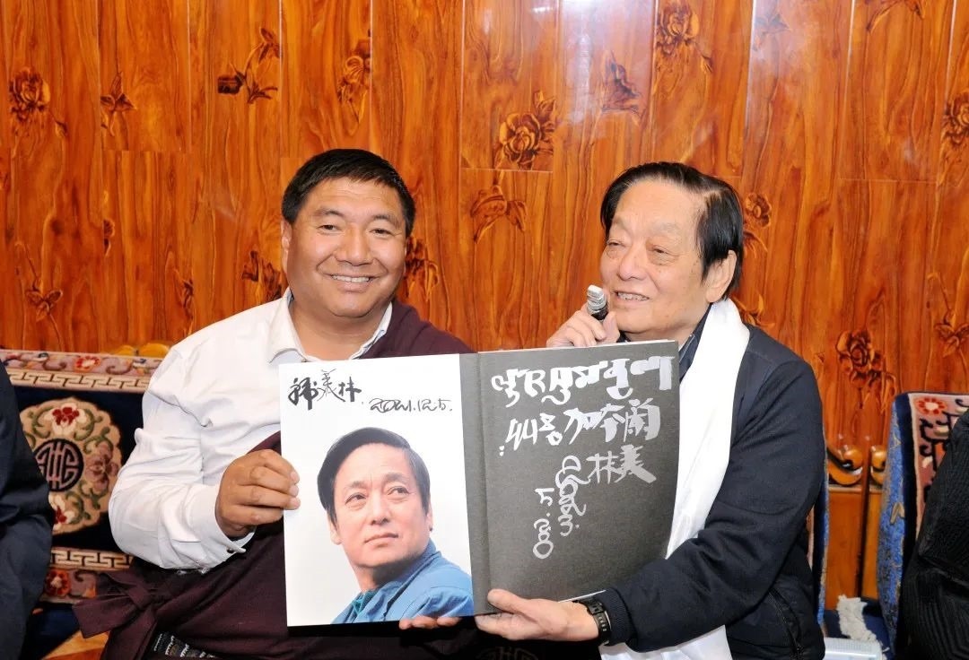 ▲韓美林為原青海省第十二屆人大常委會(huì)黨組副書記,現(xiàn)三江源生態(tài)保護(hù)基金會(huì)理事長鄧本太簽書留念