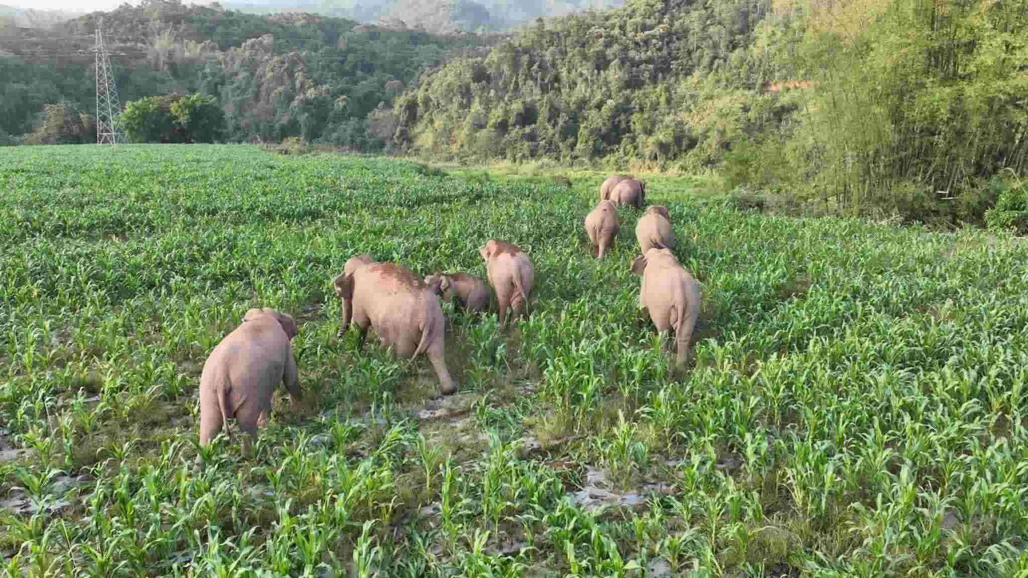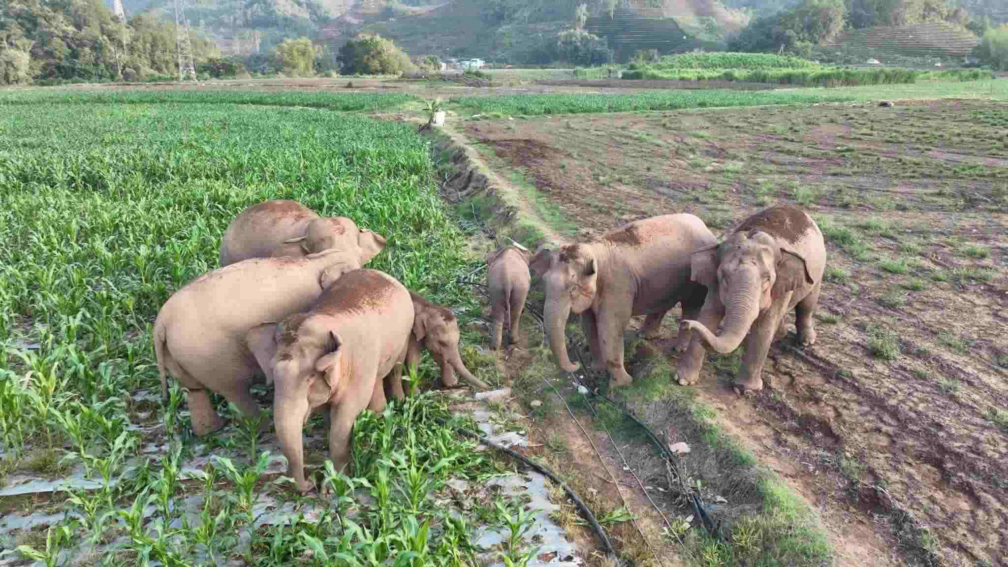 云南普洱:亞洲象群出山覓食戲水