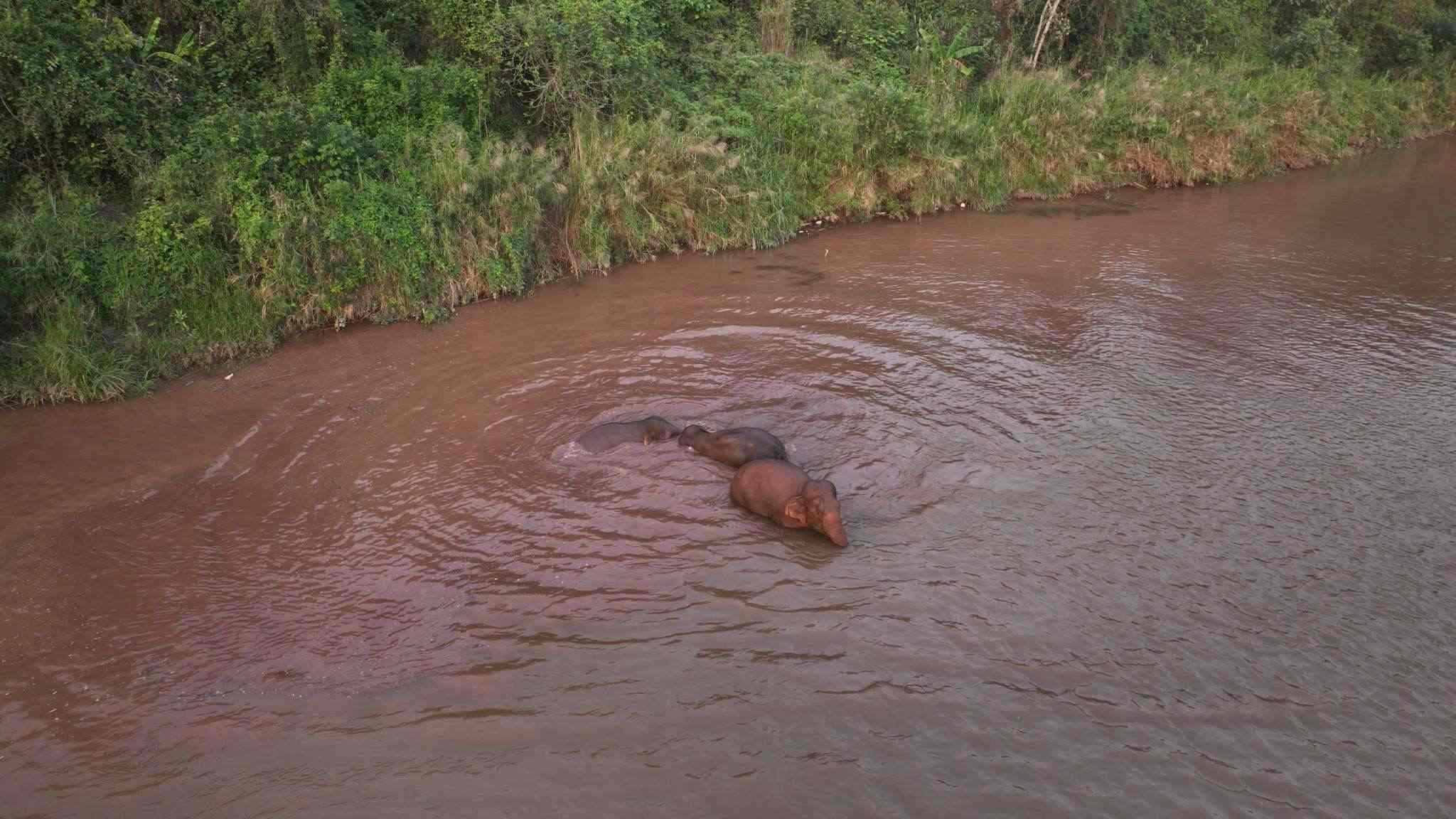 2023年5月17日,云南普洱,亞洲象群出山覓食戲水。視覺中國