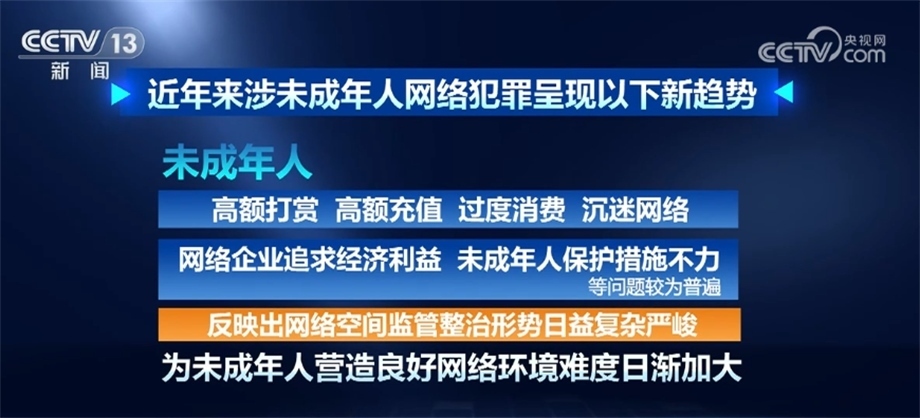 據(jù)最高檢相關(guān)部門負(fù)責(zé)人介紹,近年來涉未成年人網(wǎng)絡(luò)犯罪呈現(xiàn)以下新趨勢(shì):未成年人觸網(wǎng)低齡化日趨明顯,更易遭受網(wǎng)絡(luò)不法侵害;利用網(wǎng)絡(luò)侵害未成年人犯罪手段復(fù)雜多樣,方式不斷翻新,“網(wǎng)絡(luò)誘騙”“隔空猥褻”等新類型犯罪隱蔽性強(qiáng)、打擊難度大;一些未成年人通過網(wǎng)絡(luò)接觸暴力、色情、毒品、低俗等不良信息,導(dǎo)致形成不健康價(jià)值觀,甚至盲目跟風(fēng)、走向違法犯罪;未成年人高額打賞、高額充值、過度消費(fèi)、沉迷網(wǎng)絡(luò),網(wǎng)絡(luò)企業(yè)追求經(jīng)濟(jì)利益、未成年人保護(hù)措施不力等問題較為普遍,反映出網(wǎng)絡(luò)空間監(jiān)管整治形勢(shì)日益復(fù)雜嚴(yán)峻,為未成年人營造良好網(wǎng)絡(luò)環(huán)境難度日漸加大。
