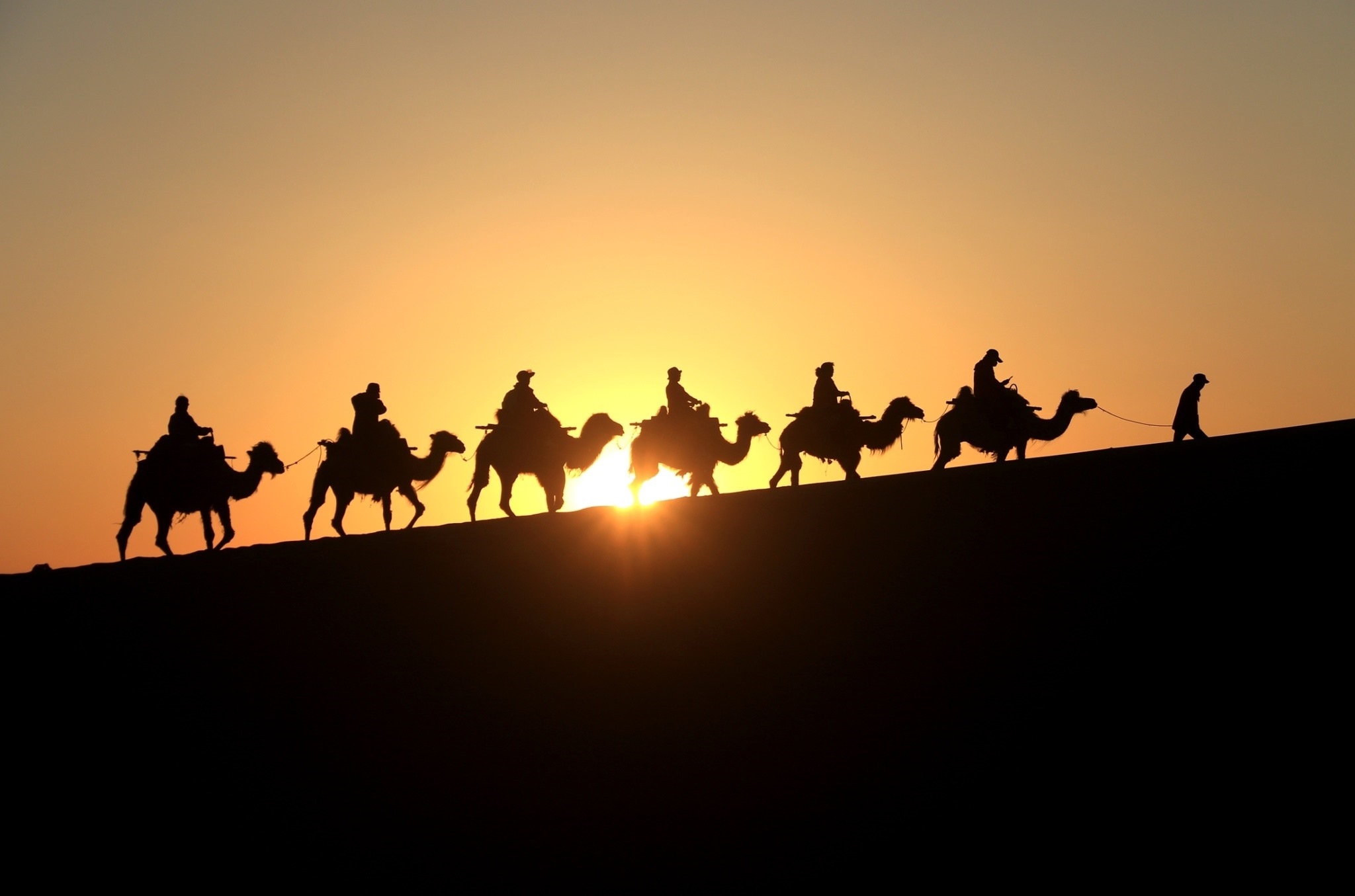 甘肅敦煌:游客騎駱駝?dòng)斡[鳴沙山
