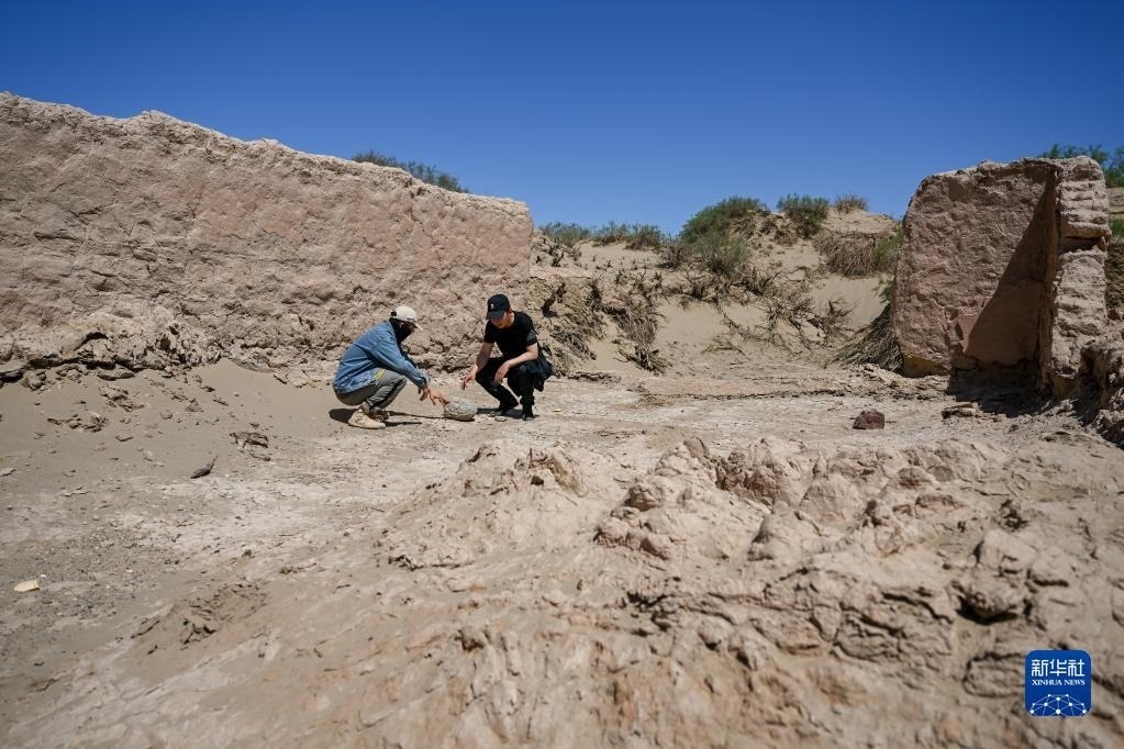6月2日,額濟(jì)納旗文物保護(hù)中心工作人員在居延遺址附近查看散落的陶片。