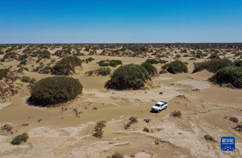 6月2日,額濟(jì)納旗文物保護(hù)中心工作人員在戈壁灘上巡護(hù)(無(wú)人機(jī)照片)。