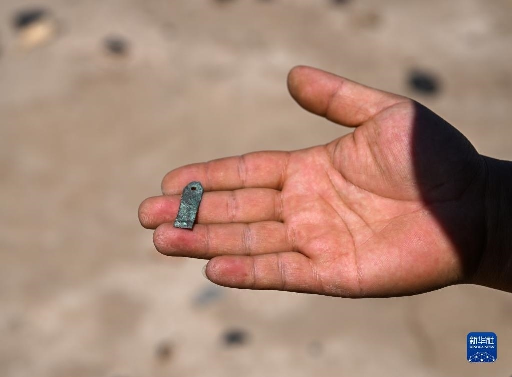這是額濟(jì)納旗文物保護(hù)中心工作人員在巡護(hù)中發(fā)現(xiàn)的銅片(6月2日攝)。