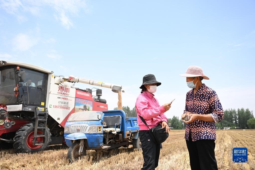 6月2日,在安徽省阜陽市阜南縣許堂鄉(xiāng)劉崗村,陳麗娟和村民確認收割費用。